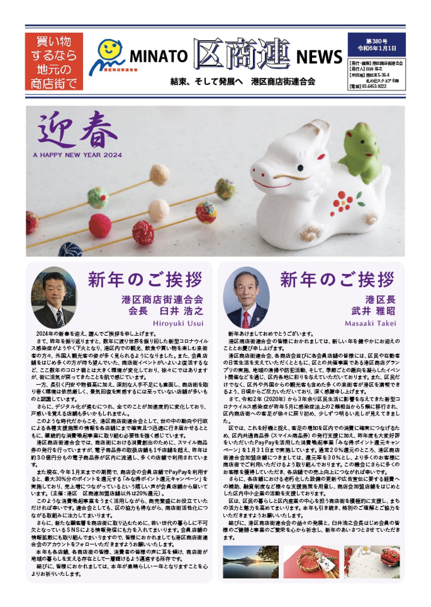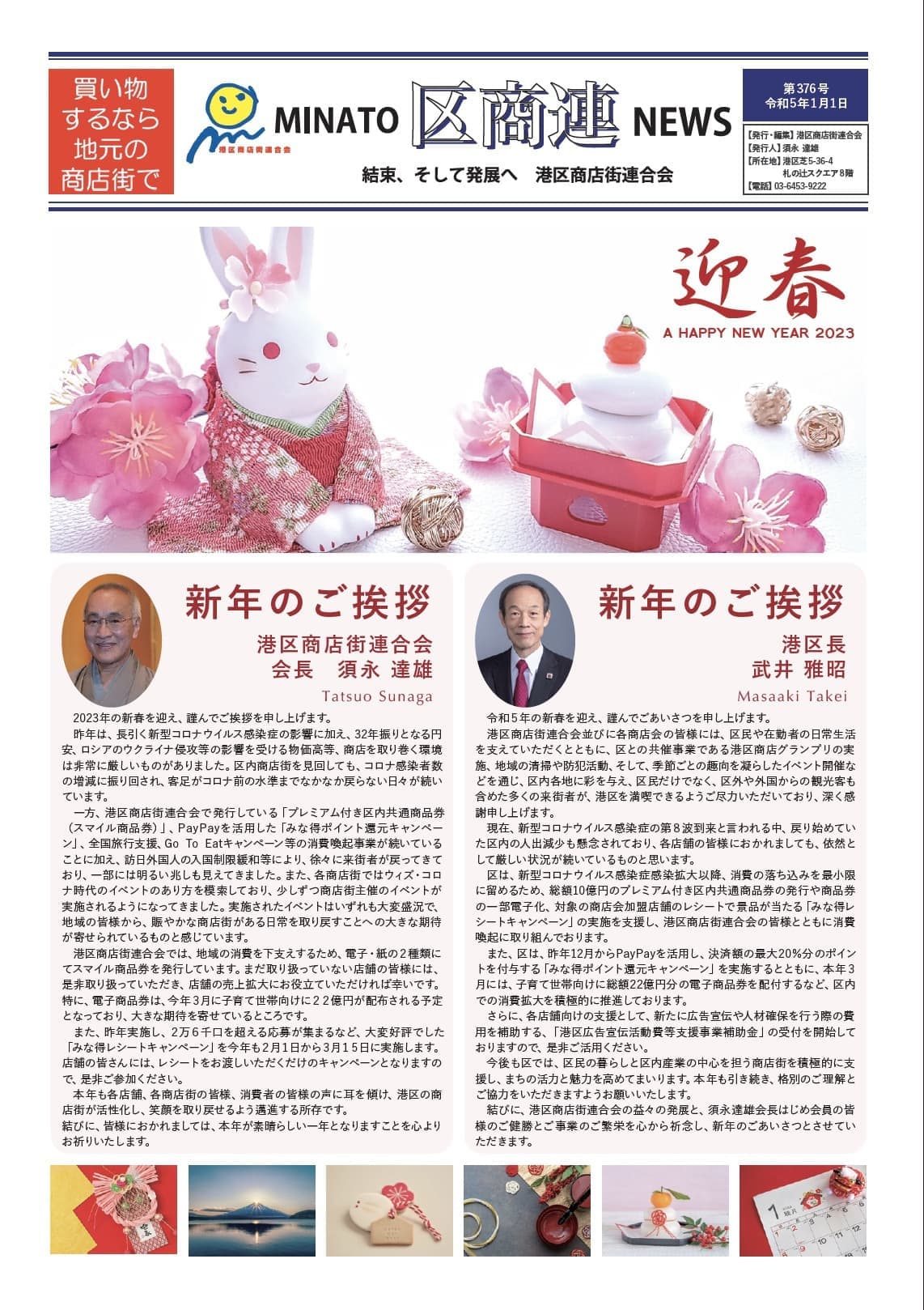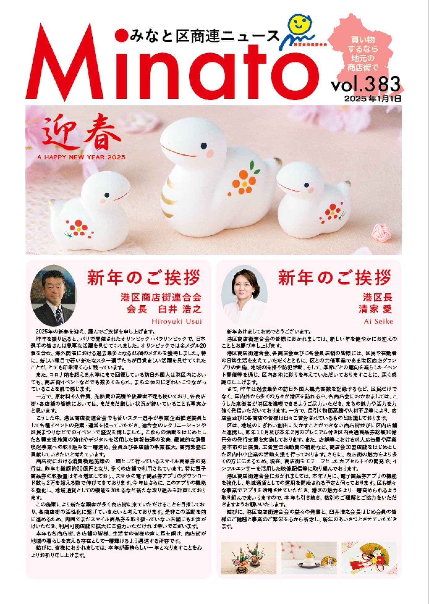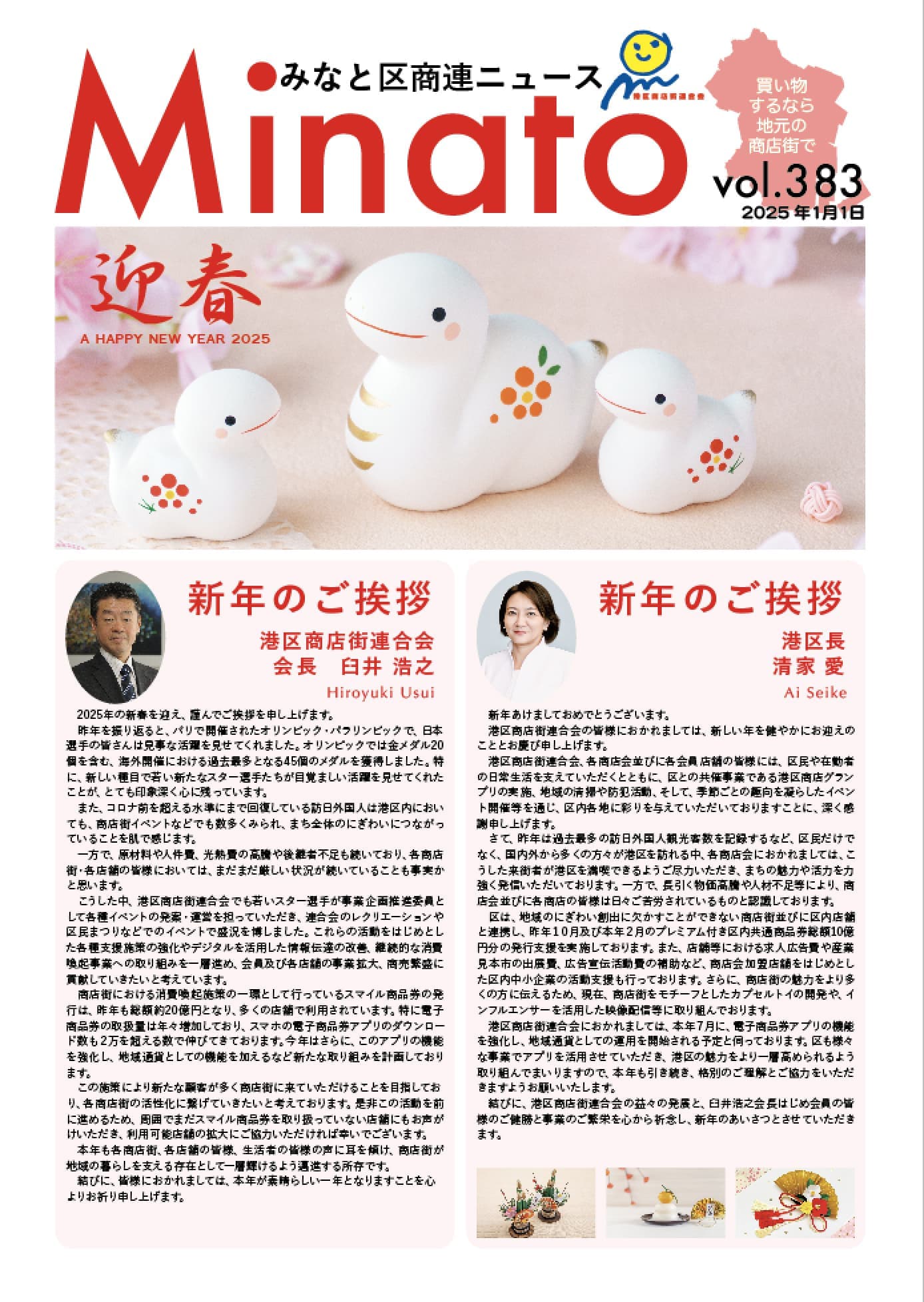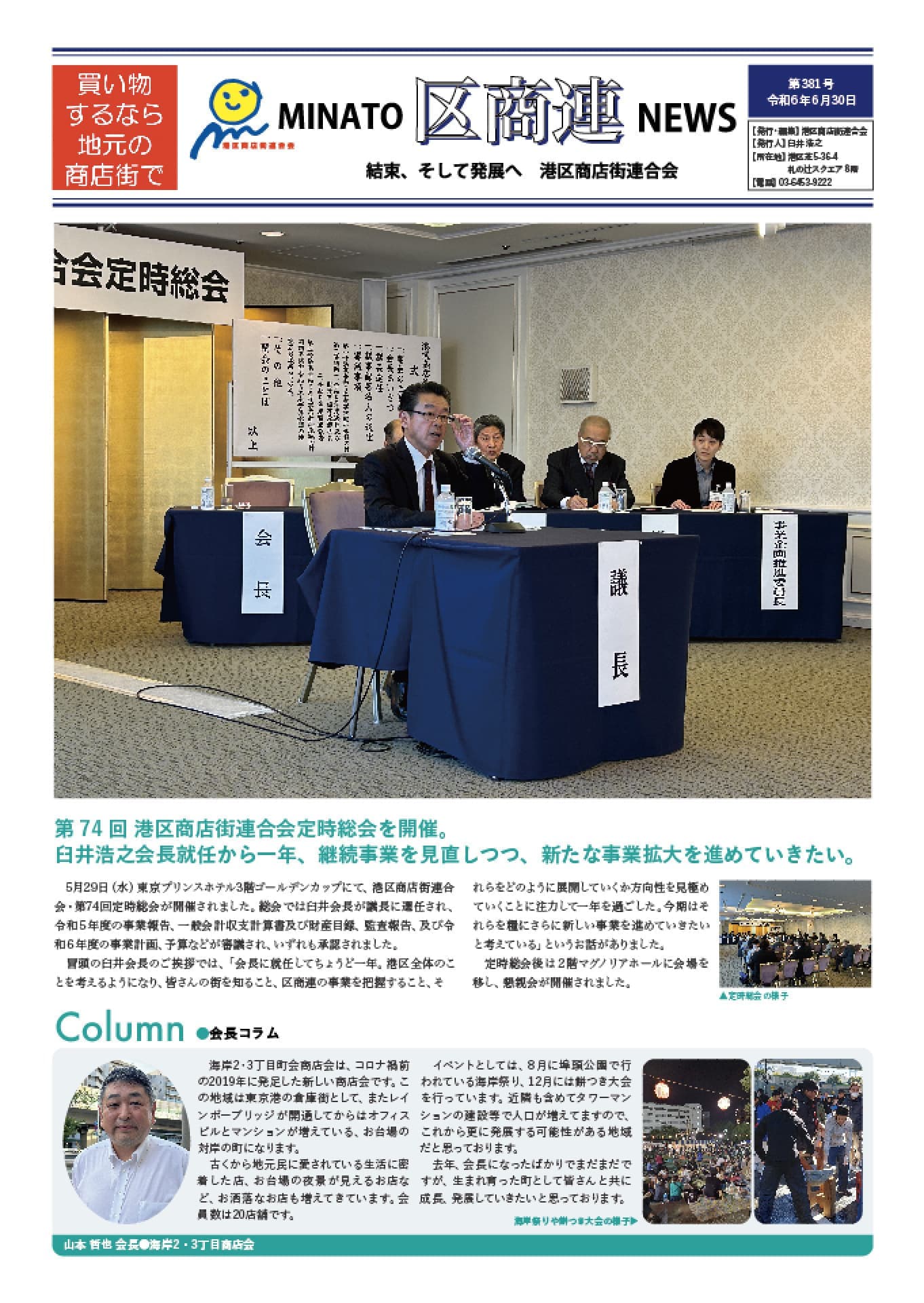 みなと区商連ニュース みなと区商連ニュースは、港区商店街連合会が年3回発行しているコミュニティ誌です。港区商店街連合会の活動をはじめ、各商店会のイベント情報やトピックスなどを掲載しています。 vol.384 2025年6月30日発行 ダウンロード vol.383 2025年1月1日発行 ダウンロード vol.382 2024年10月31日発行 ダウンロード vol.381 2024年6月30日発行 ダウンロード vol.380 2024年1月1日発行 ダウンロード vol.379 2023年10月31日発行 ダウンロード vol.378 2023年6月30日発行 ダウンロード vol.377 2023年3月31日発行 ダウンロード vol.376 2023年1月1日発行 ダウンロード vol.375 2022年10月31日発行 ダウンロード vol.374 2022年6月30日発行 ダウンロード vol.373 2022年3月31日発行 ダウンロード vol.372 2022年1月1日発行 ダウンロード vol.371 2020年10月31日発行 ダウンロード vol.370 2021年6月30日発行 ダウンロード vol.369 2021年3月31日発行 ダウンロード vol.368 2021年1月1日発行 ダウンロード vol.367 2020年10月31日発行 ダウンロード vol.366 2020年6月30日発行 ダウンロード vol.365 2020年3月31日発行 ダウンロード vol.364 2020年1月1日発行 ダウンロード vol.363 2019年10月31日発行 ダウンロード vol.362 2019年6月30日発行 ダウンロード vol.361 2019年3月22日発行 ダウンロード vol.360 2019年1月1日発行 ダウンロード vol.359 2018年10月31日発行 ダウンロード vol.358 2018年6月30日発行 ダウンロード vol.357 2018年3月20日発行 ダウンロード vol.356 2018年1月1日発行 ダウンロード vol.355 2017年10月31日発行 ダウンロード vol.354 2017年6月30日発行 ダウンロード vol.353 2017年3月31日発行 ダウンロード vol.352 2017年1月1日発行 ダウンロード vol.351 2016年10月31日発行 ダウンロード vol.350 2016年6月30日発行 ダウンロード vol.349 2016年3月31日発行 ダウンロード vol.348 2016年1月1日発行 ダウンロード vol.347 2015年10月31日発行 ダウンロード vol.346 2015年6月30日発行 ダウンロード