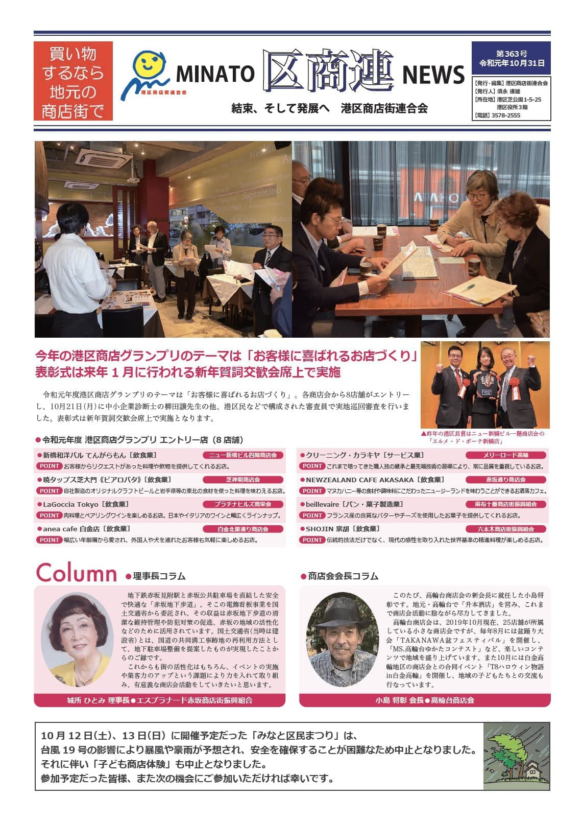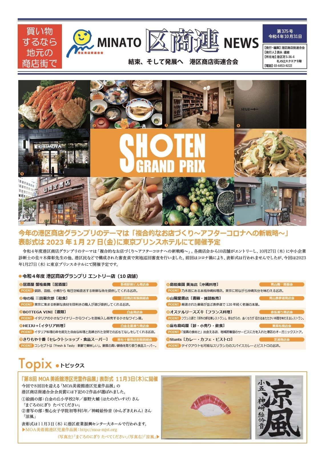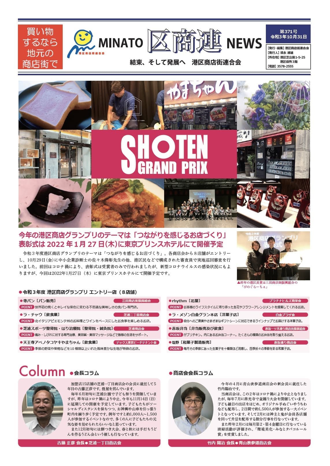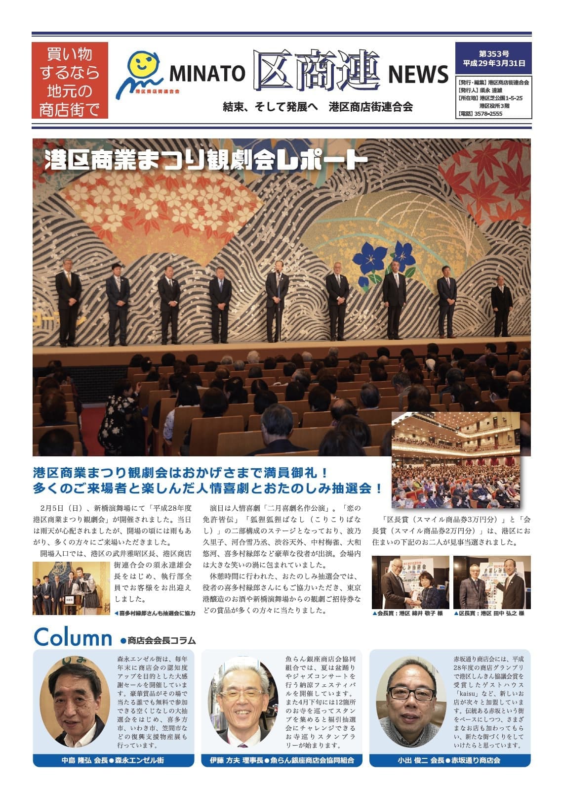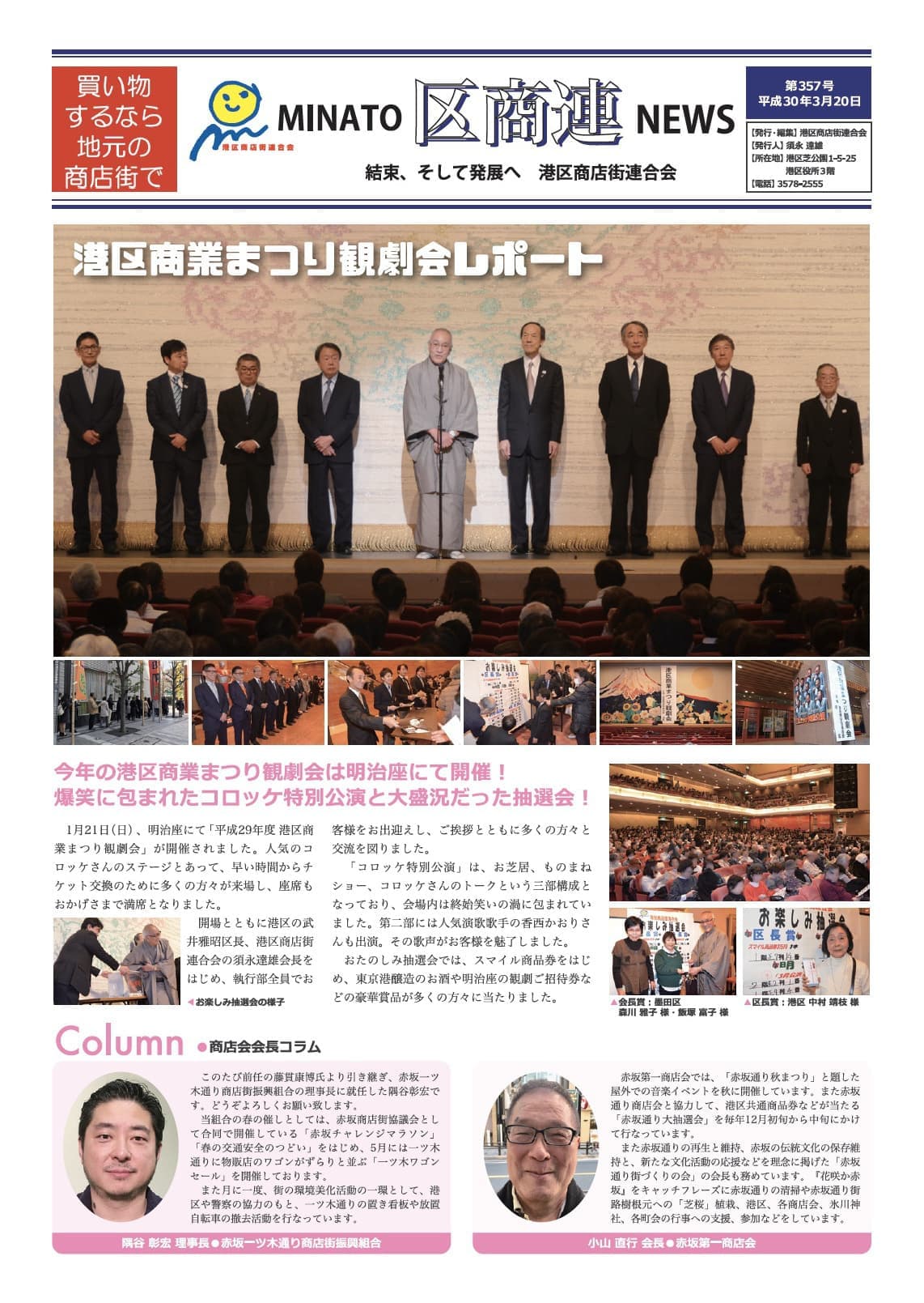 みなと区商連ニュース みなと区商連ニュースは、港区商店街連合会が年3回発行しているコミュニティ誌です。港区商店街連合会の活動をはじめ、各商店会のイベント情報やトピックスなどを掲載しています。 vol.384 2025年6月30日発行 ダウンロード vol.383 2025年1月1日発行 ダウンロード vol.382 2024年10月31日発行 ダウンロード vol.381 2024年6月30日発行 ダウンロード vol.380 2024年1月1日発行 ダウンロード vol.379 2023年10月31日発行 ダウンロード vol.378 2023年6月30日発行 ダウンロード vol.377 2023年3月31日発行 ダウンロード vol.376 2023年1月1日発行 ダウンロード vol.375 2022年10月31日発行 ダウンロード vol.374 2022年6月30日発行 ダウンロード vol.373 2022年3月31日発行 ダウンロード vol.372 2022年1月1日発行 ダウンロード vol.371 2020年10月31日発行 ダウンロード vol.370 2021年6月30日発行 ダウンロード vol.369 2021年3月31日発行 ダウンロード vol.368 2021年1月1日発行 ダウンロード vol.367 2020年10月31日発行 ダウンロード vol.366 2020年6月30日発行 ダウンロード vol.365 2020年3月31日発行 ダウンロード vol.364 2020年1月1日発行 ダウンロード vol.363 2019年10月31日発行 ダウンロード vol.362 2019年6月30日発行 ダウンロード vol.361 2019年3月22日発行 ダウンロード vol.360 2019年1月1日発行 ダウンロード vol.359 2018年10月31日発行 ダウンロード vol.358 2018年6月30日発行 ダウンロード vol.357 2018年3月20日発行 ダウンロード vol.356 2018年1月1日発行 ダウンロード vol.355 2017年10月31日発行 ダウンロード vol.354 2017年6月30日発行 ダウンロード vol.353 2017年3月31日発行 ダウンロード vol.352 2017年1月1日発行 ダウンロード vol.351 2016年10月31日発行 ダウンロード vol.350 2016年6月30日発行 ダウンロード vol.349 2016年3月31日発行 ダウンロード vol.348 2016年1月1日発行 ダウンロード vol.347 2015年10月31日発行 ダウンロード vol.346 2015年6月30日発行 ダウンロード