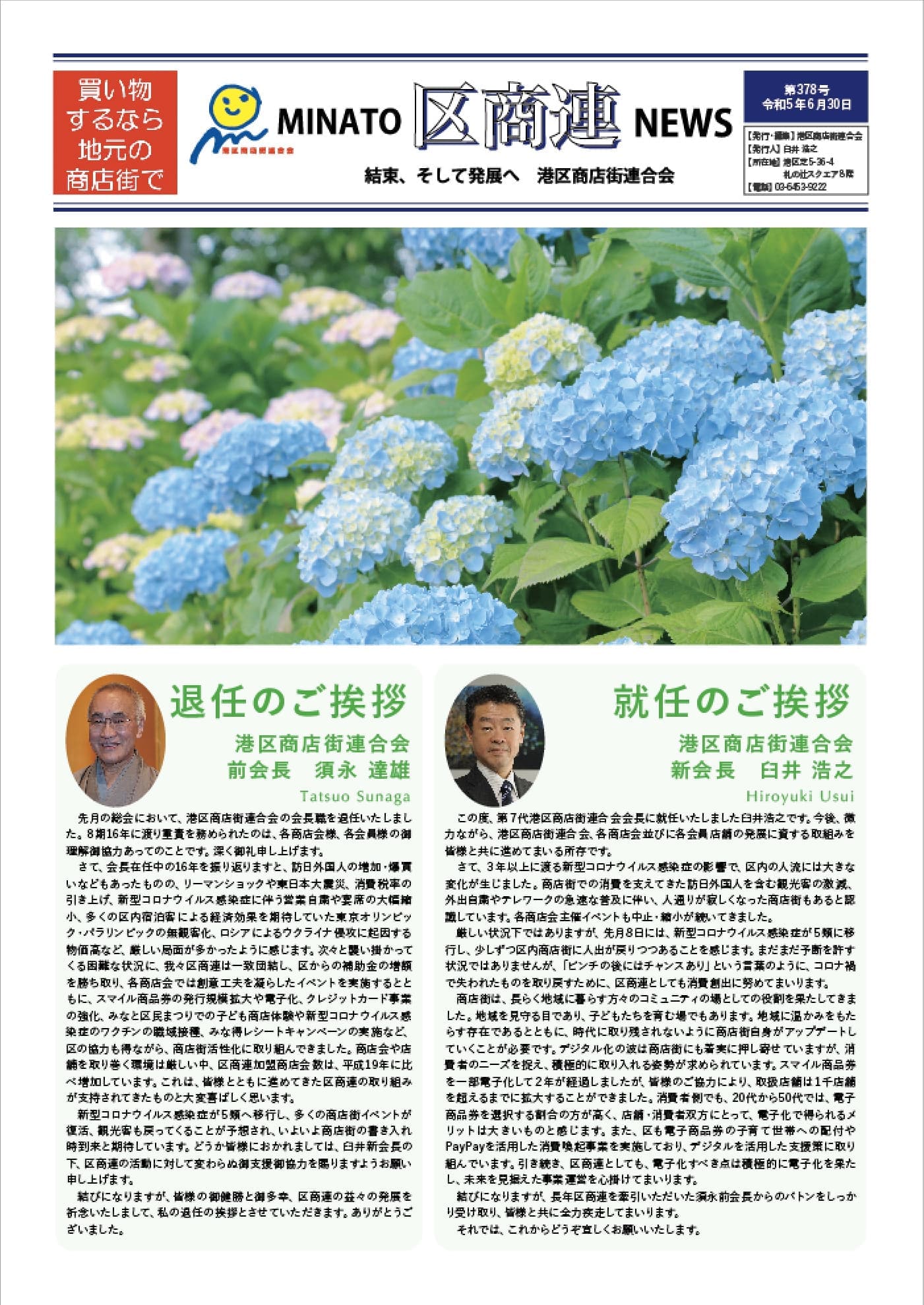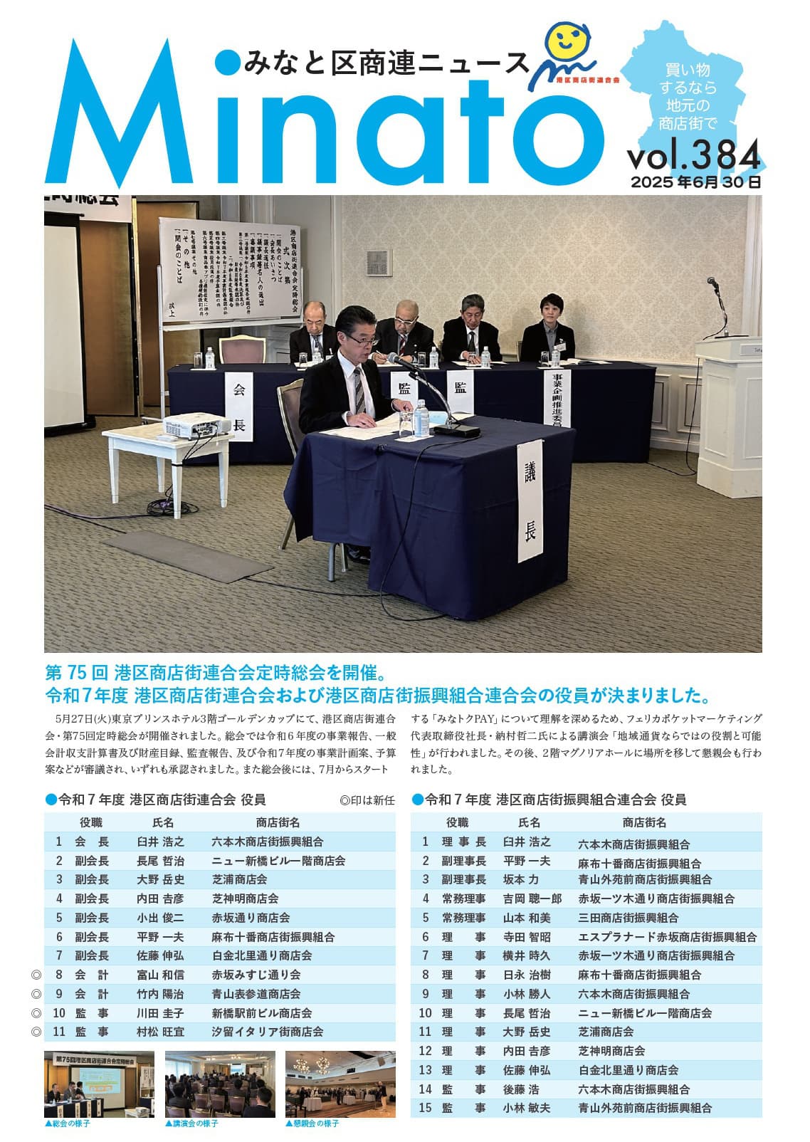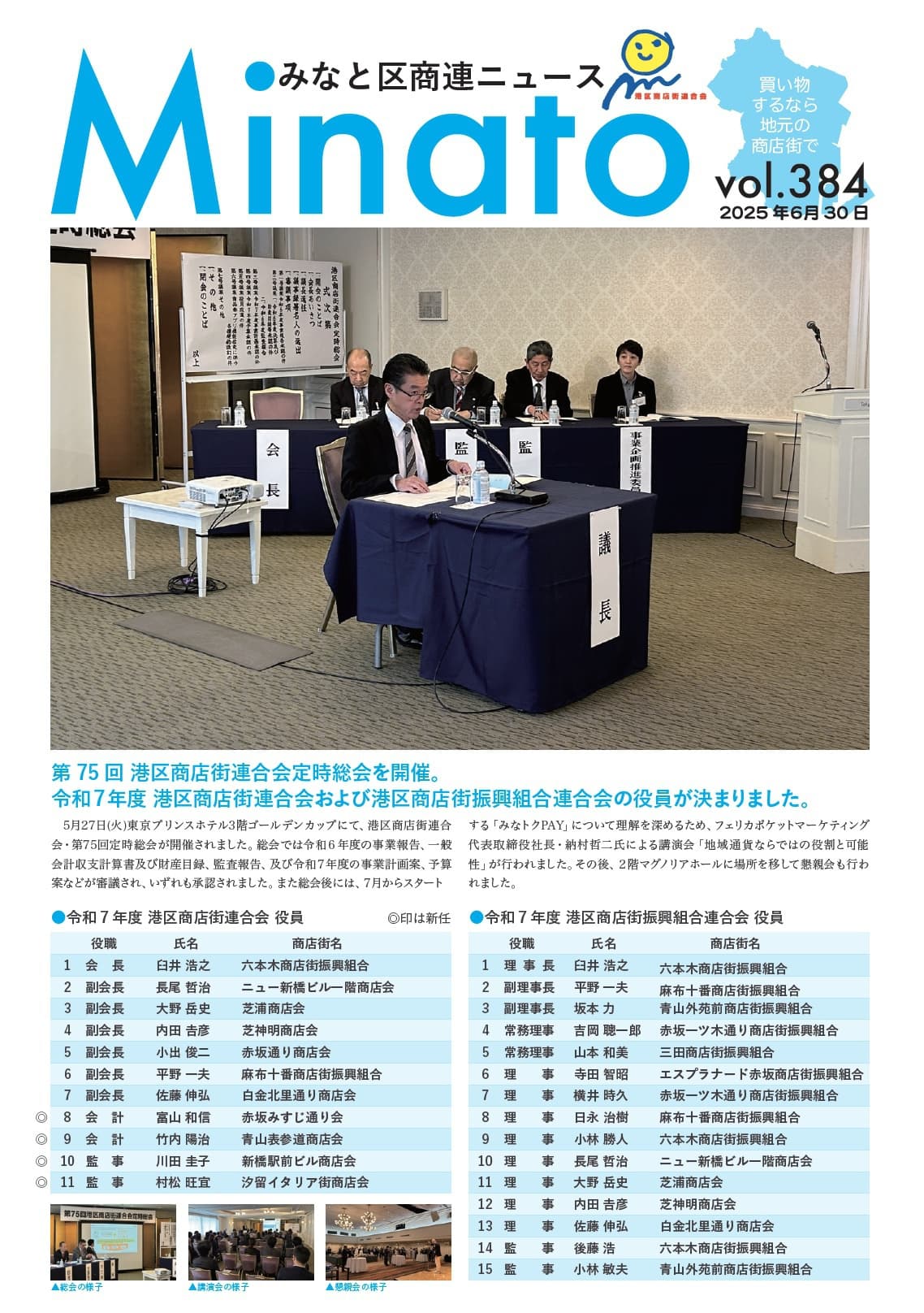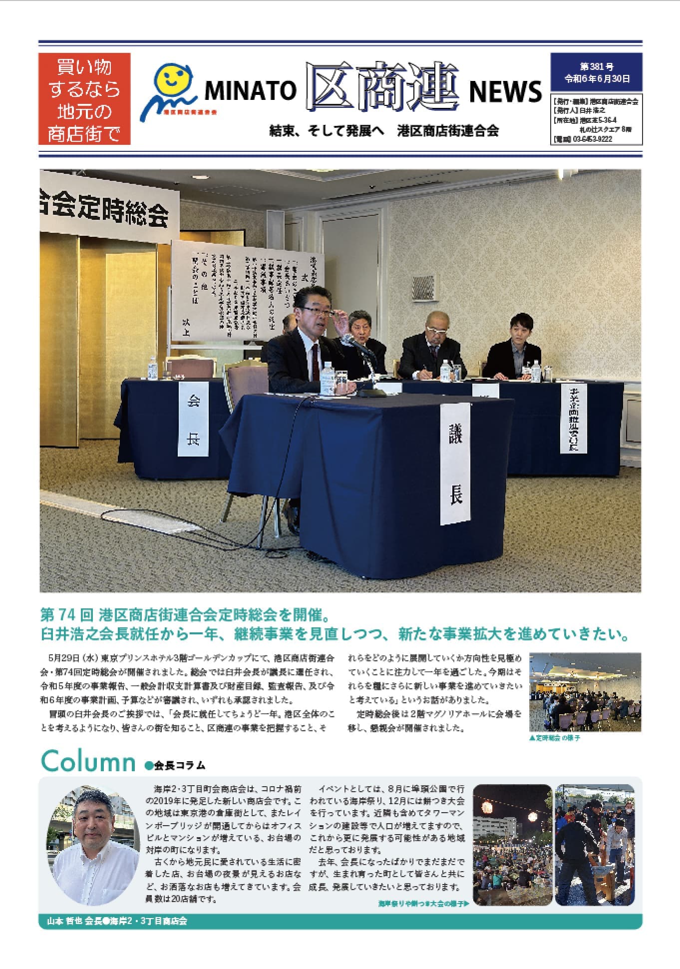 みなと区商連ニュース みなと区商連ニュースは、港区商店街連合会が年3回発行しているコミュニティ誌です。港区商店街連合会の活動をはじめ、各商店会のイベント情報やトピックスなどを掲載しています。 vol.384 2025年6月30日発行 ダウンロード vol.383 2025年1月1日発行 ダウンロード vol.382 2024年10月31日発行 ダウンロード vol.381 2024年6月30日発行 ダウンロード vol.380 2024年1月1日発行 ダウンロード vol.379 2023年10月31日発行 ダウンロード vol.378 2023年6月30日発行 ダウンロード vol.377 2023年3月31日発行 ダウンロード vol.376 2023年1月1日発行 ダウンロード vol.375 2022年10月31日発行 ダウンロード vol.374 2022年6月30日発行 ダウンロード vol.373 2022年3月31日発行 ダウンロード vol.372 2022年1月1日発行 ダウンロード vol.371 2020年10月31日発行 ダウンロード vol.370 2021年6月30日発行 ダウンロード vol.369 2021年3月31日発行 ダウンロード vol.368 2021年1月1日発行 ダウンロード vol.367 2020年10月31日発行 ダウンロード vol.366 2020年6月30日発行 ダウンロード vol.365 2020年3月31日発行 ダウンロード vol.364 2020年1月1日発行 ダウンロード vol.363 2019年10月31日発行 ダウンロード vol.362 2019年6月30日発行 ダウンロード vol.361 2019年3月22日発行 ダウンロード vol.360 2019年1月1日発行 ダウンロード vol.359 2018年10月31日発行 ダウンロード vol.358 2018年6月30日発行 ダウンロード vol.357 2018年3月20日発行 ダウンロード vol.356 2018年1月1日発行 ダウンロード vol.355 2017年10月31日発行 ダウンロード vol.354 2017年6月30日発行 ダウンロード vol.353 2017年3月31日発行 ダウンロード vol.352 2017年1月1日発行 ダウンロード vol.351 2016年10月31日発行 ダウンロード vol.350 2016年6月30日発行 ダウンロード vol.349 2016年3月31日発行 ダウンロード vol.348 2016年1月1日発行 ダウンロード vol.347 2015年10月31日発行 ダウンロード vol.346 2015年6月30日発行 ダウンロード