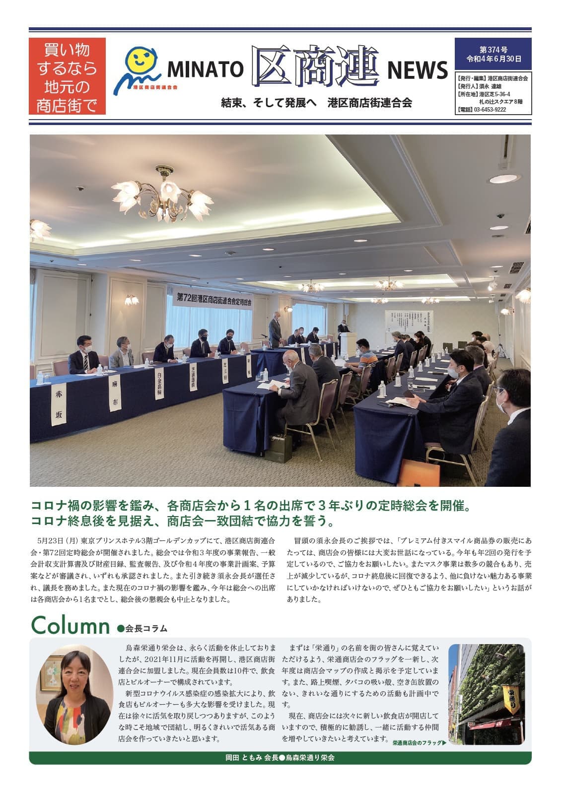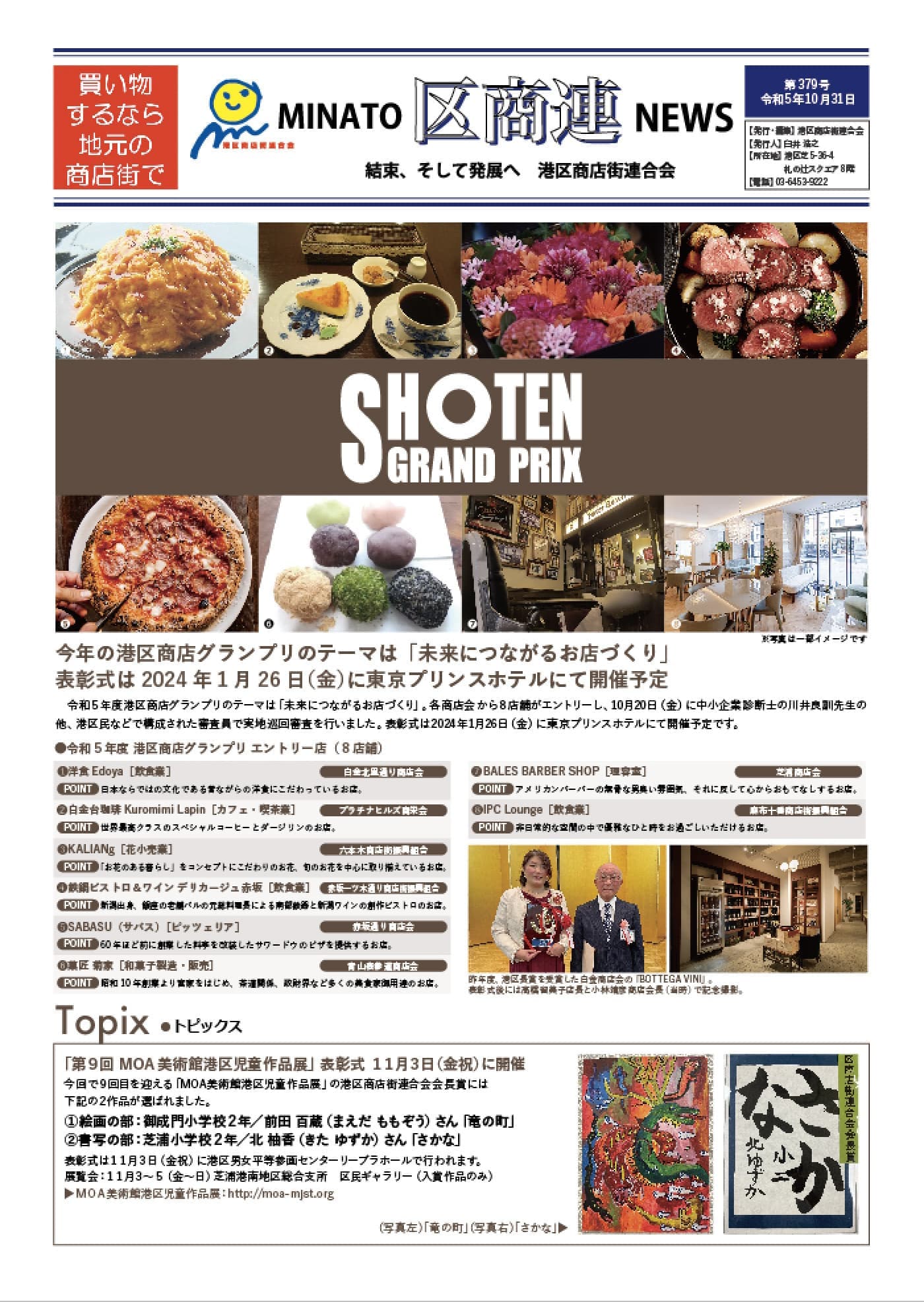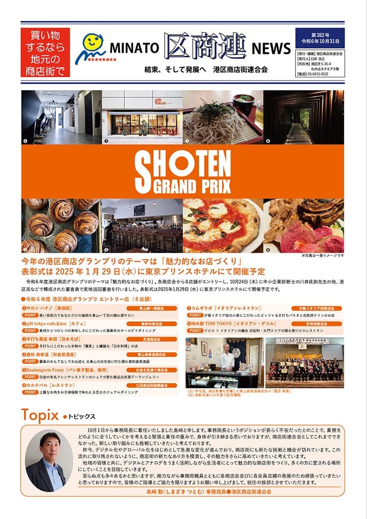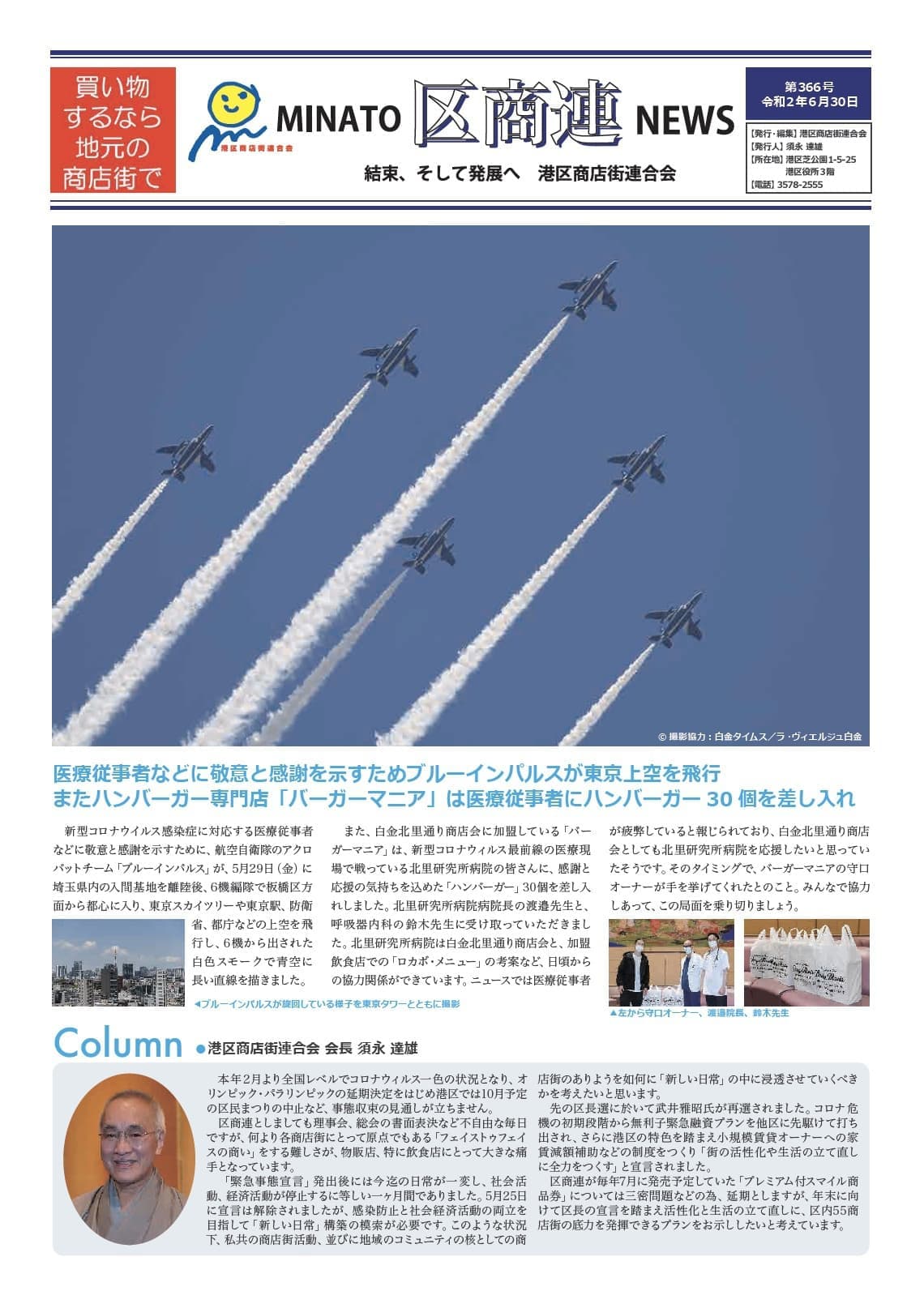 みなと区商連ニュース みなと区商連ニュースは、港区商店街連合会が年3回発行しているコミュニティ誌です。港区商店街連合会の活動をはじめ、各商店会のイベント情報やトピックスなどを掲載しています。 vol.384 2025年6月30日発行 ダウンロード vol.383 2025年1月1日発行 ダウンロード vol.382 2024年10月31日発行 ダウンロード vol.381 2024年6月30日発行 ダウンロード vol.380 2024年1月1日発行 ダウンロード vol.379 2023年10月31日発行 ダウンロード vol.378 2023年6月30日発行 ダウンロード vol.377 2023年3月31日発行 ダウンロード vol.376 2023年1月1日発行 ダウンロード vol.375 2022年10月31日発行 ダウンロード vol.374 2022年6月30日発行 ダウンロード vol.373 2022年3月31日発行 ダウンロード vol.372 2022年1月1日発行 ダウンロード vol.371 2020年10月31日発行 ダウンロード vol.370 2021年6月30日発行 ダウンロード vol.369 2021年3月31日発行 ダウンロード vol.368 2021年1月1日発行 ダウンロード vol.367 2020年10月31日発行 ダウンロード vol.366 2020年6月30日発行 ダウンロード vol.365 2020年3月31日発行 ダウンロード vol.364 2020年1月1日発行 ダウンロード vol.363 2019年10月31日発行 ダウンロード vol.362 2019年6月30日発行 ダウンロード vol.361 2019年3月22日発行 ダウンロード vol.360 2019年1月1日発行 ダウンロード vol.359 2018年10月31日発行 ダウンロード vol.358 2018年6月30日発行 ダウンロード vol.357 2018年3月20日発行 ダウンロード vol.356 2018年1月1日発行 ダウンロード vol.355 2017年10月31日発行 ダウンロード vol.354 2017年6月30日発行 ダウンロード vol.353 2017年3月31日発行 ダウンロード vol.352 2017年1月1日発行 ダウンロード vol.351 2016年10月31日発行 ダウンロード vol.350 2016年6月30日発行 ダウンロード vol.349 2016年3月31日発行 ダウンロード vol.348 2016年1月1日発行 ダウンロード vol.347 2015年10月31日発行 ダウンロード vol.346 2015年6月30日発行 ダウンロード
