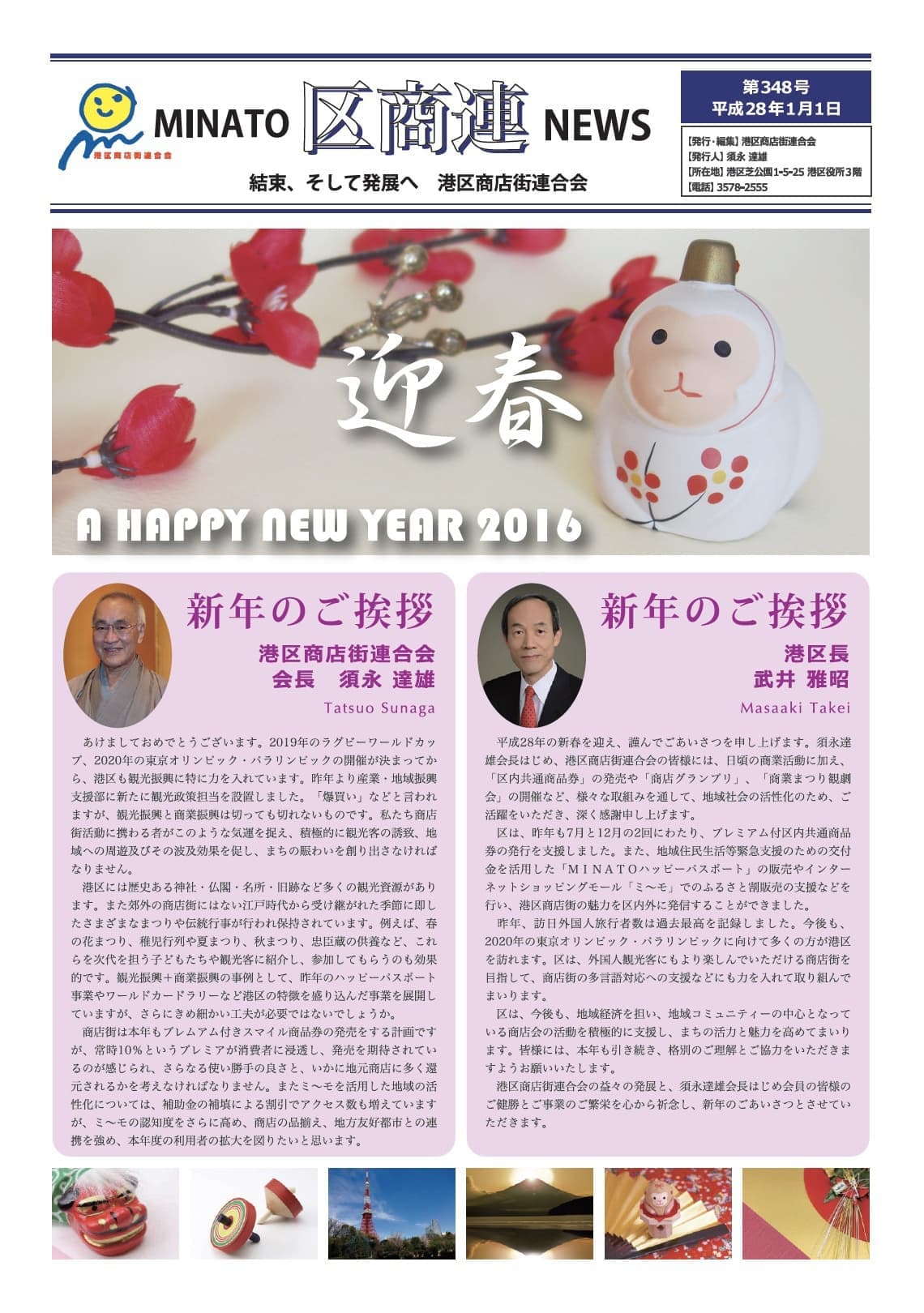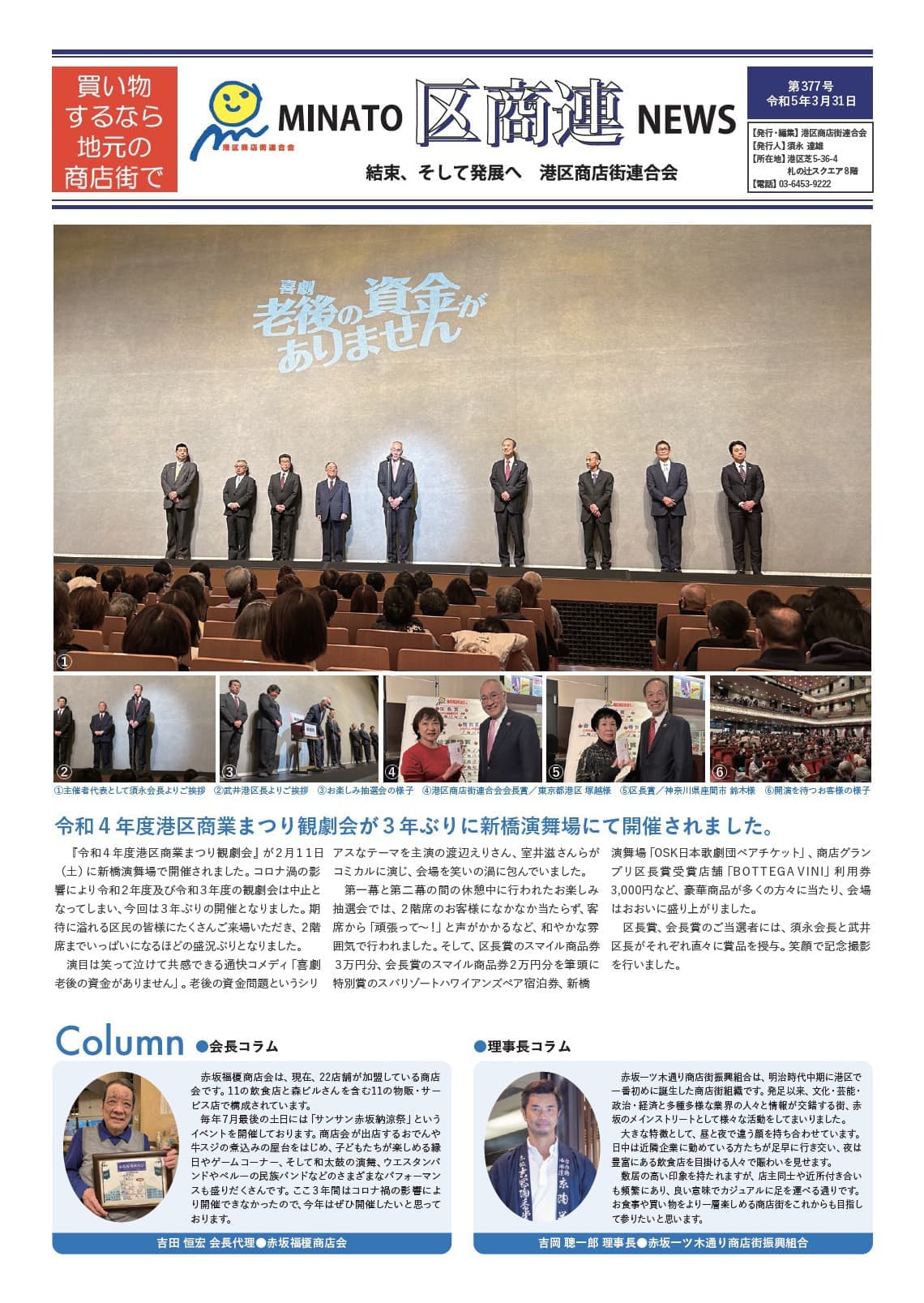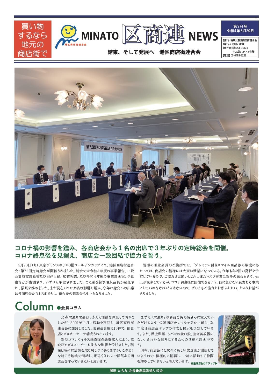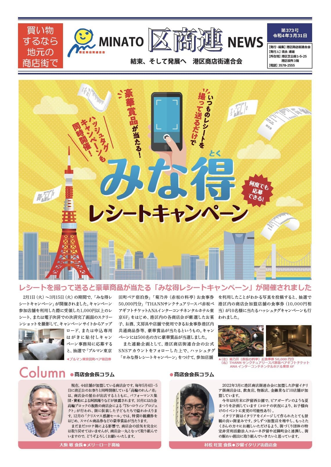 みなと区商連ニュース みなと区商連ニュースは、港区商店街連合会が年3回発行しているコミュニティ誌です。港区商店街連合会の活動をはじめ、各商店会のイベント情報やトピックスなどを掲載しています。 vol.384 2025年6月30日発行 ダウンロード vol.383 2025年1月1日発行 ダウンロード vol.382 2024年10月31日発行 ダウンロード vol.381 2024年6月30日発行 ダウンロード vol.380 2024年1月1日発行 ダウンロード vol.379 2023年10月31日発行 ダウンロード vol.378 2023年6月30日発行 ダウンロード vol.377 2023年3月31日発行 ダウンロード vol.376 2023年1月1日発行 ダウンロード vol.375 2022年10月31日発行 ダウンロード vol.374 2022年6月30日発行 ダウンロード vol.373 2022年3月31日発行 ダウンロード vol.372 2022年1月1日発行 ダウンロード vol.371 2020年10月31日発行 ダウンロード vol.370 2021年6月30日発行 ダウンロード vol.369 2021年3月31日発行 ダウンロード vol.368 2021年1月1日発行 ダウンロード vol.367 2020年10月31日発行 ダウンロード vol.366 2020年6月30日発行 ダウンロード vol.365 2020年3月31日発行 ダウンロード vol.364 2020年1月1日発行 ダウンロード vol.363 2019年10月31日発行 ダウンロード vol.362 2019年6月30日発行 ダウンロード vol.361 2019年3月22日発行 ダウンロード vol.360 2019年1月1日発行 ダウンロード vol.359 2018年10月31日発行 ダウンロード vol.358 2018年6月30日発行 ダウンロード vol.357 2018年3月20日発行 ダウンロード vol.356 2018年1月1日発行 ダウンロード vol.355 2017年10月31日発行 ダウンロード vol.354 2017年6月30日発行 ダウンロード vol.353 2017年3月31日発行 ダウンロード vol.352 2017年1月1日発行 ダウンロード vol.351 2016年10月31日発行 ダウンロード vol.350 2016年6月30日発行 ダウンロード vol.349 2016年3月31日発行 ダウンロード vol.348 2016年1月1日発行 ダウンロード vol.347 2015年10月31日発行 ダウンロード vol.346 2015年6月30日発行 ダウンロード